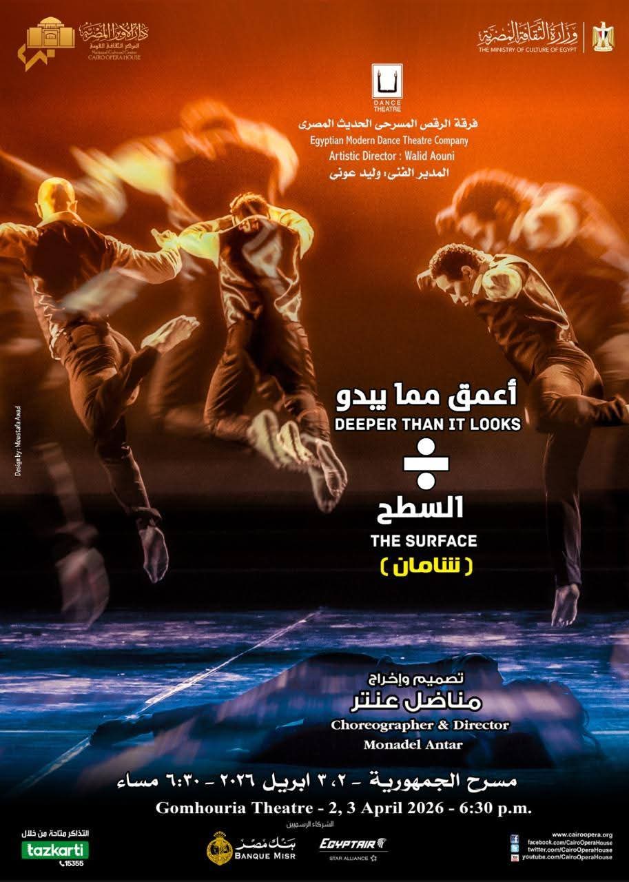 تقدم دار الأوبرا المصرية عرض" أعمق مما يبدو على السطح" تصميم واخراج مناضل عنتر فى ليلتين لفرقة الرقص المسرحى الحديث تحت إشراف مديرها الفنى وليد عونى وذلك فى السادسة والنصف مساء يومى الخميس والجمعة ٢، ٣ أبريل على مسرح الجمهورية .