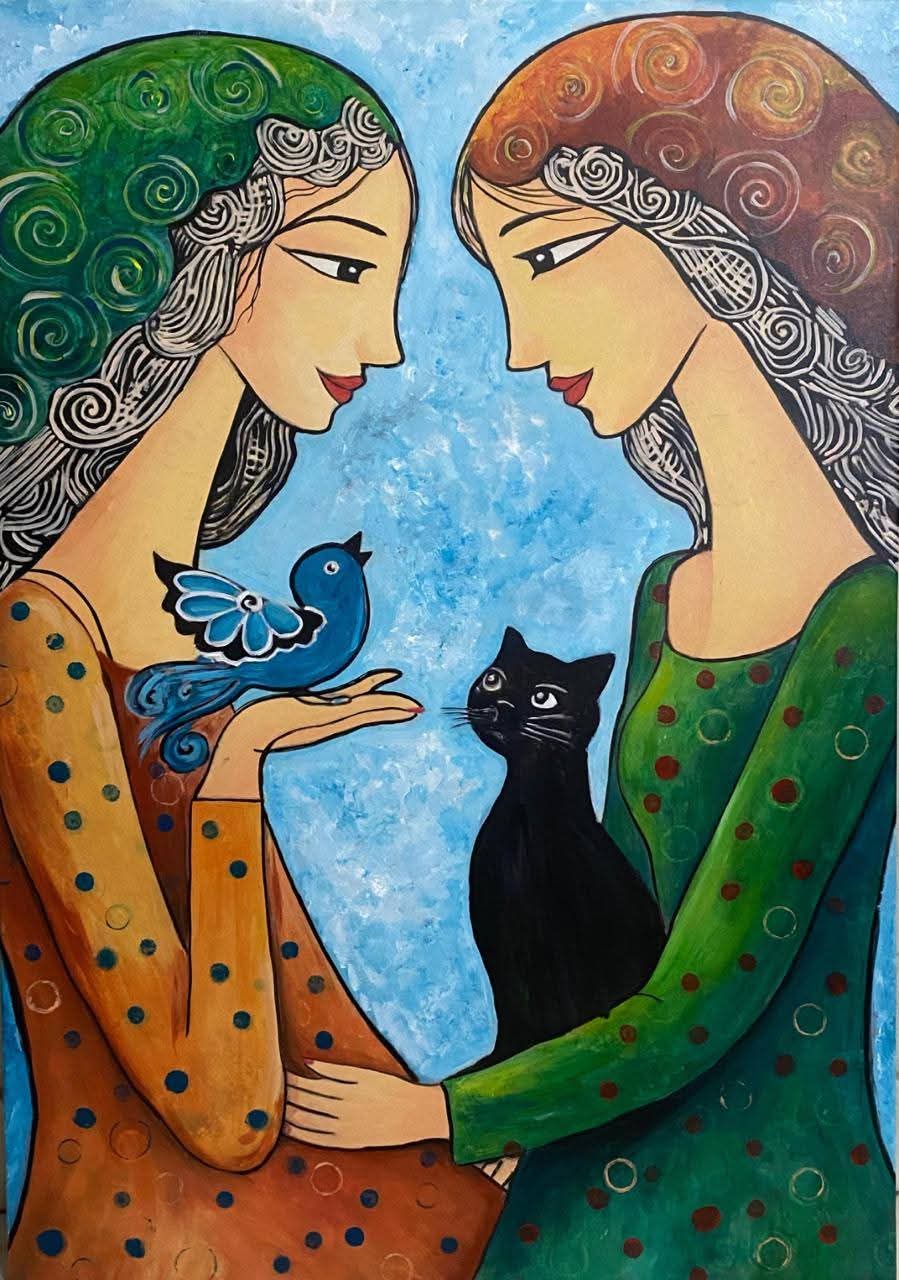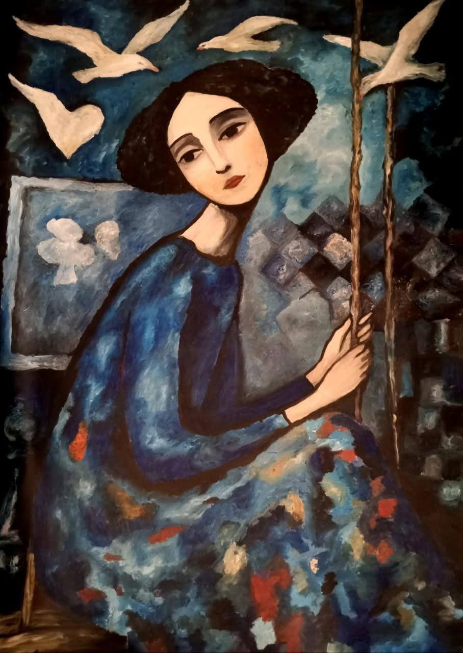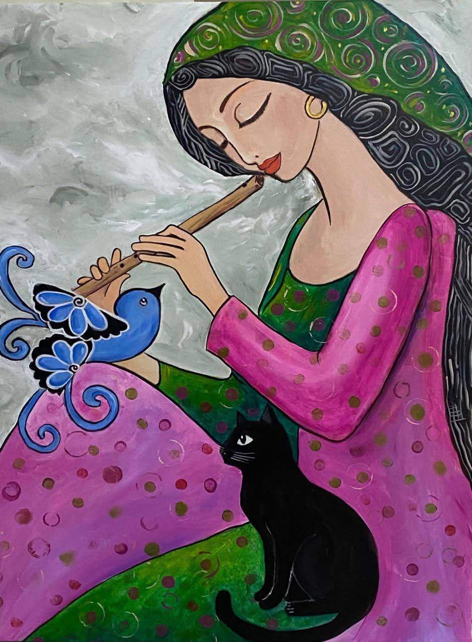يضم المعرض مجموعة من ١٩ لوحة منفذة باستخدام ألوان الأكريليك على الكانفاس مع تقنيات الملمس الخشن وتنسج علاقة شاعرية بين الوجوه وعناصر الطبيعة حيث تتحول الملامح إلى مساحات تعبيرية تكشف عن حالات شعورية إنسانية متعددة تتأرجح بين الفرح والتأمل والشجن وتظهر خلالها مفردات رمزية مثل الطيور والآلات الموسيقية وتعتمد على استخدام الوحدات الزخرفية داخل التكوينات والخلفيات لتمنح الإحساس بالحركة والانسياب .