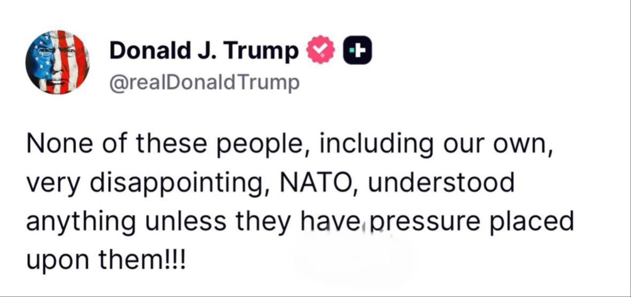 وقال ترامب في منشوره: "لا أحد من هؤلاء الناس، بما في ذلك حلف الناتو الخاص بنا والمخيب للآمال للغاية، يفهم أي شيء ما لم يتم ممارسة الضغط عليهم"، في إشارة إلى ما يراه افتقارًا للاستجابة السريعة إلا من خلال الضغط.