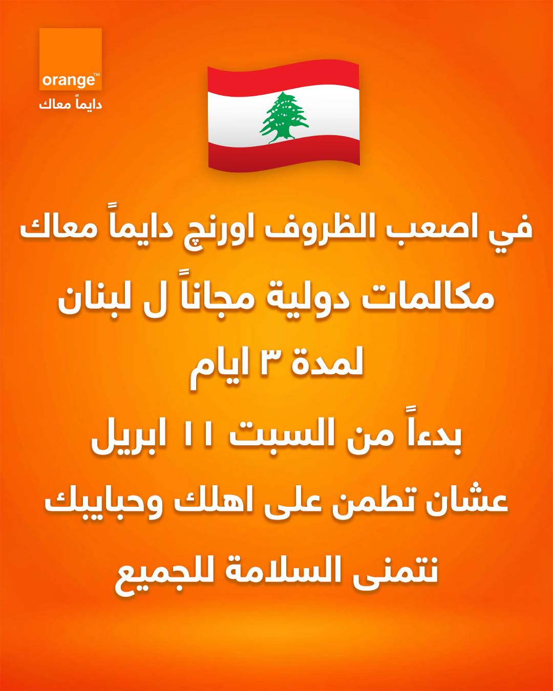 أعلنت شركة «أورنج مصر» عن إتاحة 5 دقائق دولية مجانية يومياً من مصر إلى لبنان لجميع العملاء للاطمئنان علي ذويهم .