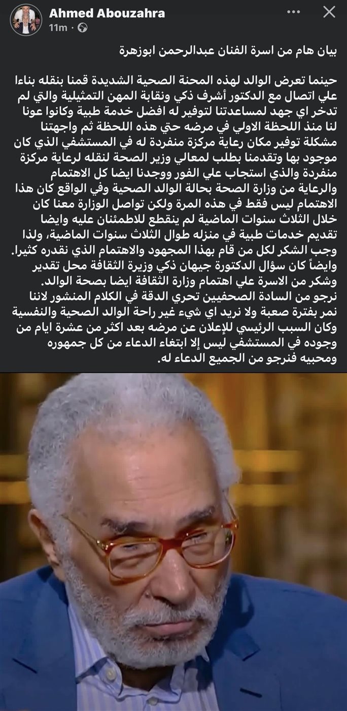 في بيان رسمي.. نجل عبدالرحمن أبوزهرة يوضح دور نقابة الممثلين ووزارة الصحة فى متابعة حالة والده