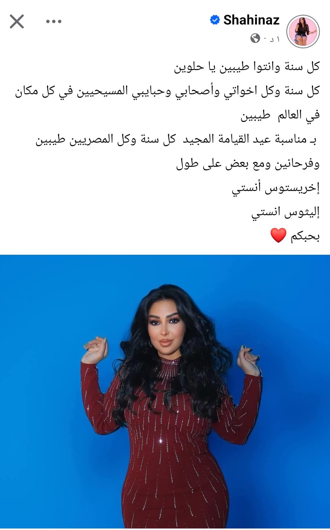 حرصت النجمة والمطربة شاهيناز على تهنئة الأخوة المسحيين بـ عيد القيامة المجيد ، وعلقت شاهيناز على الصور قائلة: