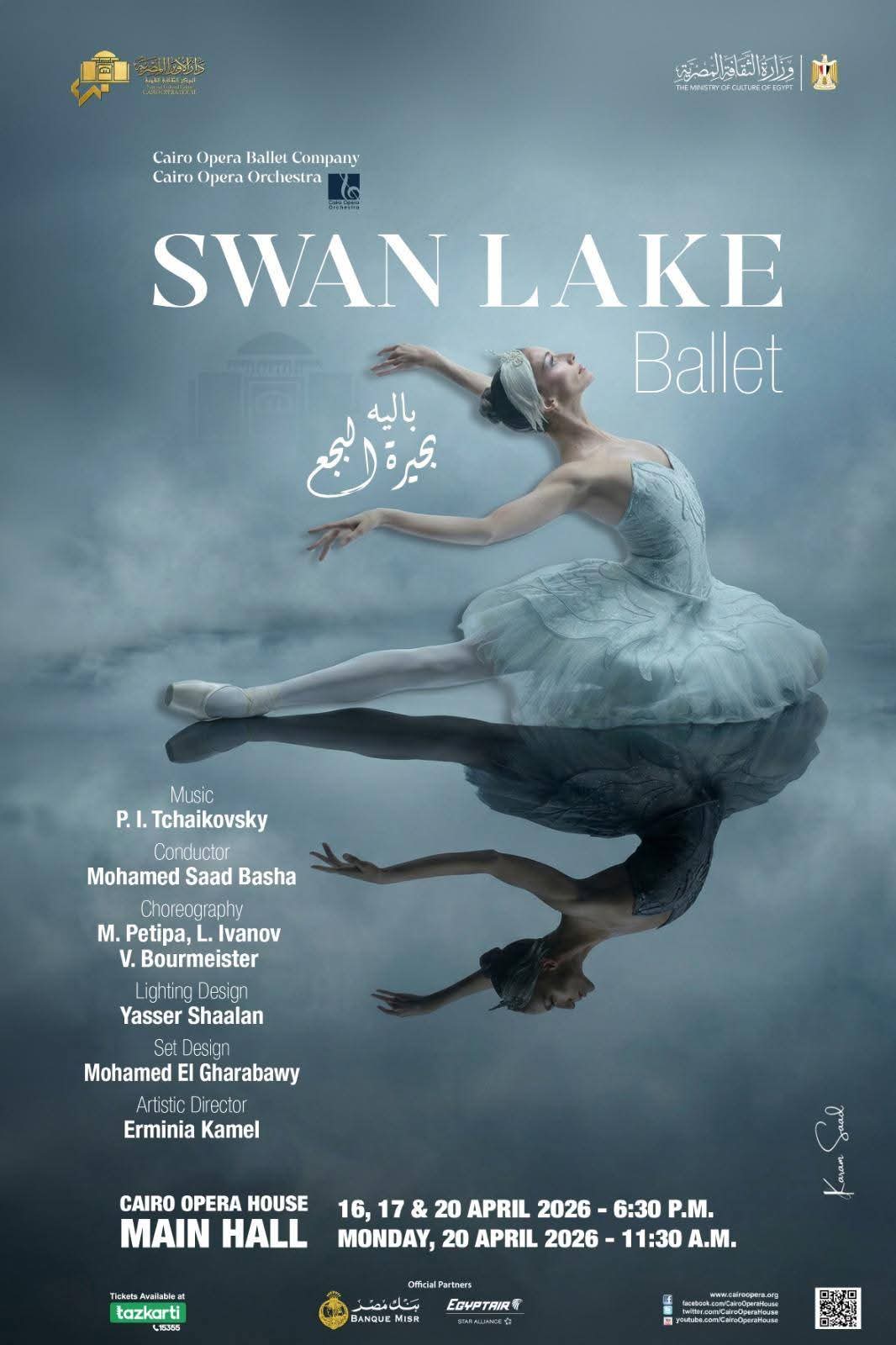 تقدم فرقة باليه أوبرا القاهرة تحت إشراف مديرها الفنى ارمينيا كامل بمصاحبة أوركسـترا أوبرا القاهرة بقيادة مديره الفنى المايسترو محمد سعد باشا العرض الكلاسيكى الشهير باليه بحيرة البجع للموسيقار الروسى تشايكوفسكى فى 4 عروض تقام على المسرح الكبير وذلك فى السادسة والنصف مساء الخميس، الجمعة، الاثنين 16، 17، 20 أبريل والحادية عشرة والنصف صباح الاثنين 20 أبريل .
