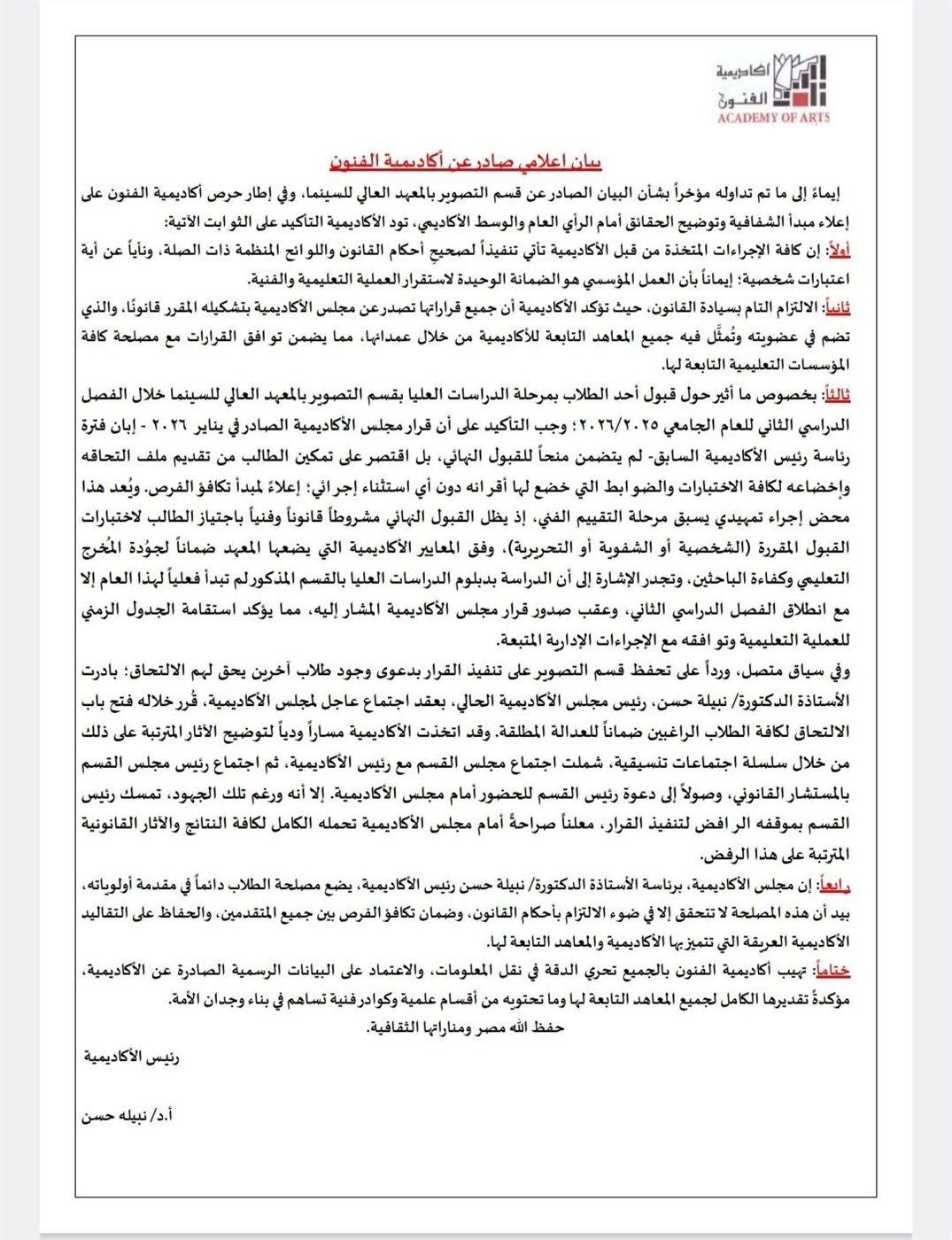 أولاً: أن جميع الإجراءات المتخذة من قبل الأكاديمية تأتي تنفيذًا صحيحًا لأحكام القانون واللوائح المنظمة ذات الصلة، ونأيًا عن أية اعتبارات، إعلاءً لمبدأ الشفافية وترسيخًا للعمل المؤسسي كضمانة لاستقرار العملية التعليمية والفنية.