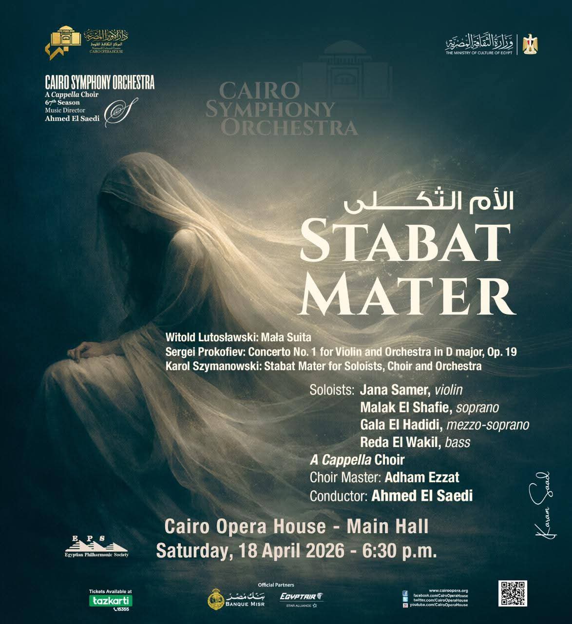 تقيم دار الأوبرا المصرية حفلاً لأوركسترا القاهرة السيمفونى تحت عنوان الأم الثكلى" و يقوده المايسترو أحمد الصعيدى وتشارك خلاله عازفة الفيولينة جانا سامر، السوبرانو ملك الشافعى، الميتزو سوبرانو جالا الحديدى والباص رضا الوكيل بمصاحبة كورال أكابيلا بقيادة أدهم عزت وذلك فى السادسة والنصف مساء السبت ١٨ أبريل على المسرح الكبير .