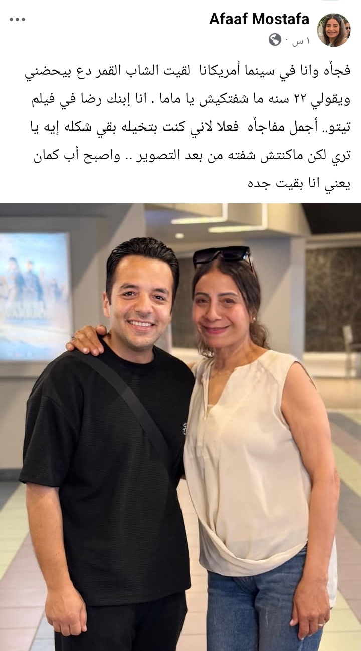 فنشرت عفاف مصطفى صورة برفقة الشاب عبر حسابها علي موقع التواصل فيسبوك، وكتبت: "فجأه وانا في سينما أمريكانا لقيت الشاب القمر دا بيحضنى ويقولي 22 سنة ما شفتكيش يا ماما.. أنا ابنك رضا في فيلم تيتو".
