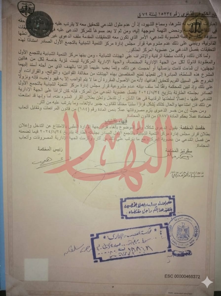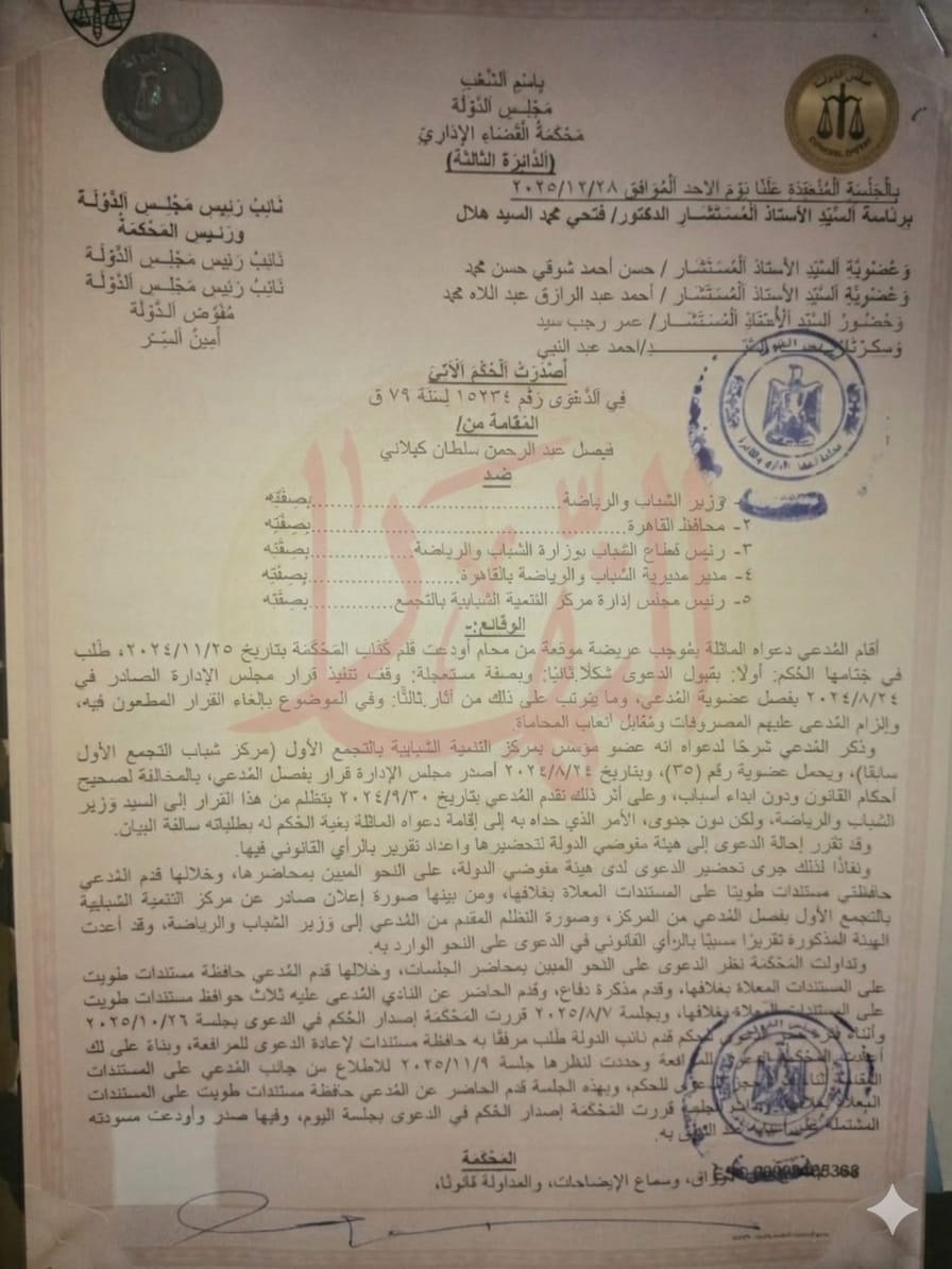 منذ فترة، أصدرت محكمة القضاء الإداري حكمها التاريخي في الدعوى رقم 15234 لسنة 79 ق، والذي قضى ببطلان قرار فصل عضو الجمعية العمومية فيصل عبدالرحمن سلطان (رئيس المركز السابق وأحد مؤسسيه)، المحكمة في حيثياتها لم تكتفِ بإلغاء قرار الفصل، بل أكدت أن القرار اتسم بالانحراف بالسلطة وافتقر لأدنى ضمانات التحقيق، واصفةً امتناع الجهة الإدارية عن التدخل بأنه قرار سلبي مخالف للقانون.