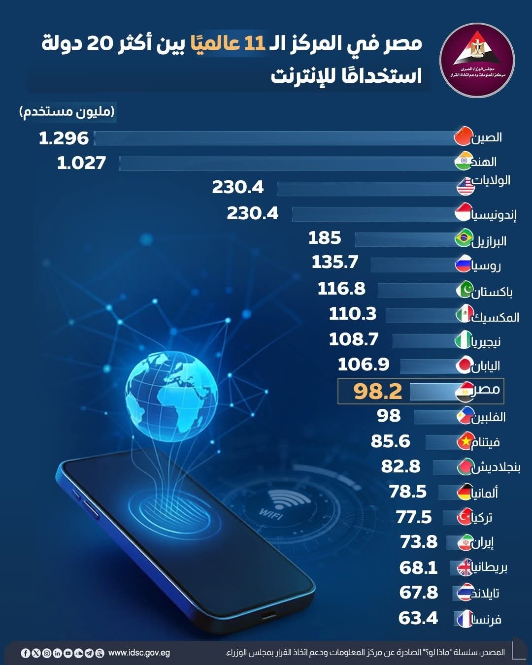 فوفقاً لمركز المعلومات ودعم اتخاذ القرار التابع لمجلس الوزراء احتلت مصر المركز الحادي عشر عالميًا بنحو 98.2 مليون مستخدم للإنترنت، وبنسبة انتشار تبلغ نحو 82.7%، وهو ما يعكس تحسنًا ملحوظًا في البنية التحتية الرقمية واتساع نطاق الوصول إلى خدمات الإنترنت داخل البلاد.