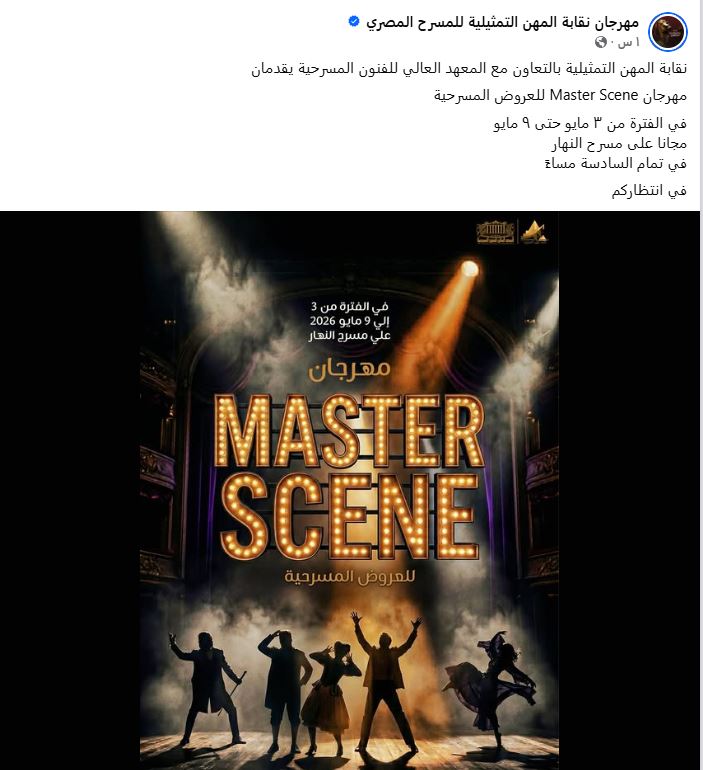 تستعد نقابة المهن التمثيلية بالتعاون مع المعهد العالي للفنون المسرحية لإطلاق فعاليات مهرجان “ماستر سين” للعروض المسرحية، وذلك خلال الفترة من 3 مايو وحتى 9 مايو، على مسرح النهار.