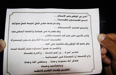 وجاء في البيان: "أخي في الوطن وفي الإسلام.. لن تكون شهيدًا وقد حرَّضت على قتل أخيك قبل موتك، ولن تعز الإسلام وقد حصرته في جماعة وأخفت الناس منه، ولن تكون على حق وقد مُلئت بالكبر فظننت أنك أفضل من غيرك، ولن يتسع لك الوطن وقد تعاليت على أهلك وأنكرت حق أبنائه بمشاركتك فيه، فتدبر أمرك وراجع نفسك واحزم غضبك، وإن ظننت أن النجاة في الجماعة، فتذكر أنك ستموت وحدك وستلقى الله وحدك وستحاسب وحدك، اللهم بلغت اللهم فاشهد".