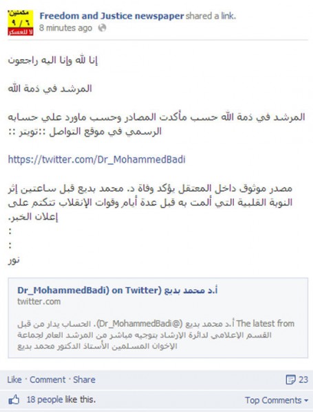 نشرت صحيفة منسوبة لجريدة الحرية والعدالة على موقع التواصل الاجتماعى فيس بوك نبأ وفاة المرشد العام لجماعة الإخوان المسلمين، محمد بديع إثر نوبة قلبية.