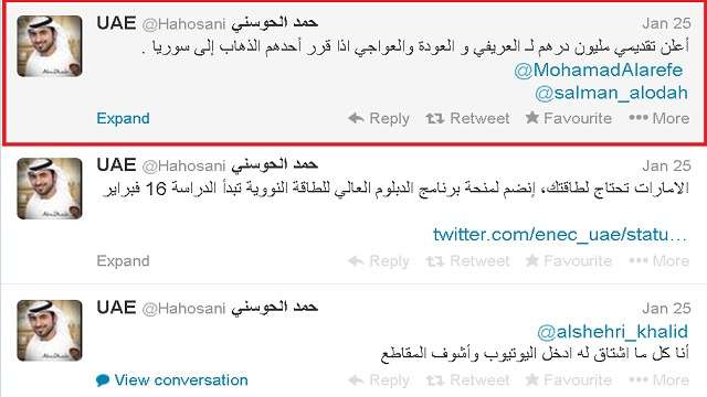 أعلن ناشط إماراتي استعداده لتقديم مليون درهم لأشخاص ذكر أسماء عائلاتهم دون ذكر أسماءهم، هم العريفي والعودة والعواجي، شريطة أن يقرر أحدهم الذهاب إلى سورية، وذلك في تغريدة نشرها على صفحته في موقع "تويتر". وتبدو تغريدة الناشط ويدعى حمد الحوسني وكأنها رسالة موجهة لدعاة إسلاميين هم محمد العريفي وسلمان العودة ومحسن العواجي، سيما وأن هذه الدعوة جاءت بعد أيام من هجوم شنه الإعلامي السعودي داوود الشريان على مجموعة من الدعاة، متهما إياهم بالتغرير بالشباب السعودي للتوجه إلى سورية والقتال فيها، داعيا إياهم إلى إرسال أبنائهم للقتال والفوز بالجنة حسب قوله. إلى ذلك افترض مراقب أن التغريدة تسمح لأي شخص يحمل اسم أي من العائلات المذكورة الحصول على المال، في حال "قرر" التوجه إلى سورية فقط، دون الانخراط في أي عمل مسلح هناك.