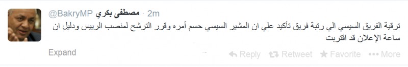 تعليق مصطفى بكرى على توتير لترقية السيسي الى رتبة مشير