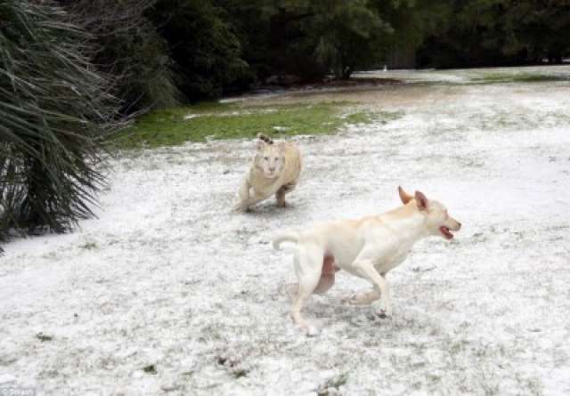 النمور البيضاء النادرة اعتادت على بودا طوال حياتهم واعتادوا على اللعب معا في ساحة مترامية الأطراف في محمية للحياة البرية - ولكن الثلج هو الشيء الذي لم يسبق لهم معرفته من قبل.
