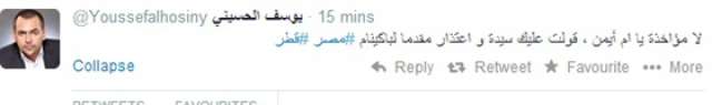 وقال الحسينى عبر"تويتر": "أكثر ثلاث سيدات مصدومات من ترشح السيسي "أم أيمن، وزوجة مرسي، وعلاء صادق".