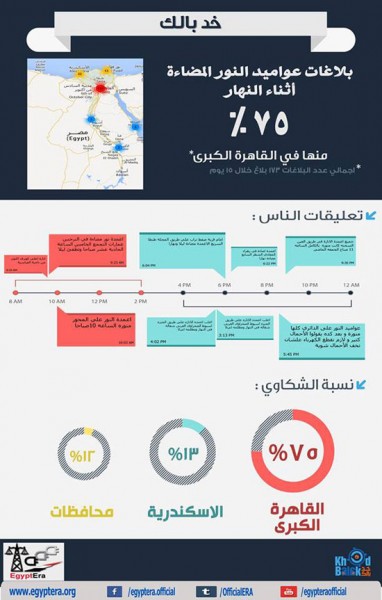 وأوضح الجهاز فى بيان له أن 75% من بلاغات إضاءة أعمدة الكهرباء نهارا بـ"القاهرة الكبرى"، و13% بـ"الإسكندرية"، و12% فى باقى المحافظات.