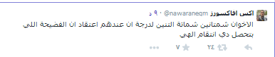 وأضافت "نوارة" في تغريدة لها عبر موقع "تويتر"، اليوم الأربعاء: "الإخوان شمتانين شماتة التنين لدرجة إن عندهم اعتقاد إن الفضيحة اللي بتحصل دي انتقام إلهي".