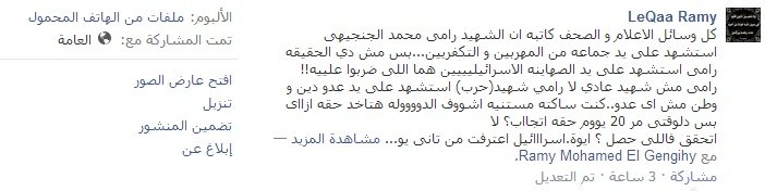 وأضافت خلال صفحتها بفيس بوك: رامى استشهد على يد الصهاينة الإسرائيليين، بعد أن أطلقوا عليه النار، مشيرًة أن رامى مش شهيد عادي لا رامي شهيد(حرب) استشهد على يد عدو دين و وطن مش اى عدو، وكنت "ساكته مستنيه" أشوف الدولة، للحصول علي حقه ، بس دلوقتى مر 20 يوم حقه لم يأت.