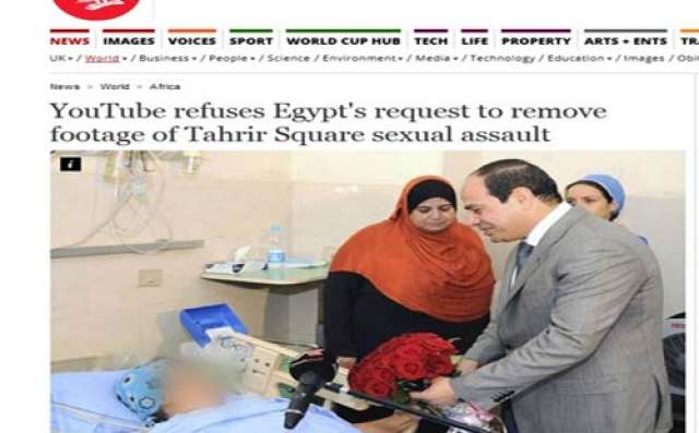 تحت عنوان "اليوتيوب يرفض طلب مصر لحذف مشهد الاعتداء الجنسي في ميدان التحرير"، ذكرت صحيفة "الإندبندنت" البريطانية أن موقع "يوتيوب" رفض طلب الحكومة المصرية بحذف مقطع الاعتداء الجنسي العنيف بالقاهرة.