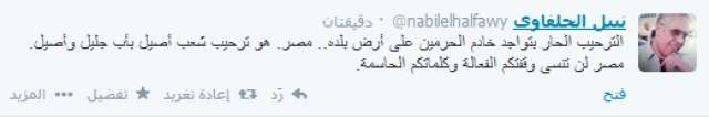 وقال "الحلفاوى"، في تغريدة له عبر موقع "تويتر"،: "الترحيب الحار بتواجد خادم الحرمين على أرض بلده مصر هو ترحيب شعب أصيل بأب جليل وأصيل، مصر لن تنسى وقفتكم الفعالة وكلماتكم الحاسمة".