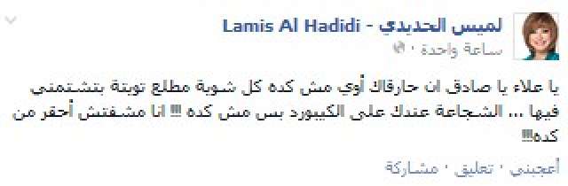 وقالت "لميس" في تدوينة لها عبر صفحتها الشخصية بموقع "فيس بوك"، اليوم السبت: "يا علاء يا صادق أنا حرقاك أوي مش كده.. كل شوية تطلع تويتة تشتمني فيها.. الشجاعة عندك على الكيبورد بس مش كده !!! أنا مشفتش أحقر من كده!!!".