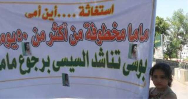 وحمل أبناء السيدة المختفية صورًا لها، ولافتات مكتوب عليها "استغاثة .. أين أمى .. ماما مخطوفة من أكثر من 50 يوما .. بوسى تناشد السيسى برجوع ماما".