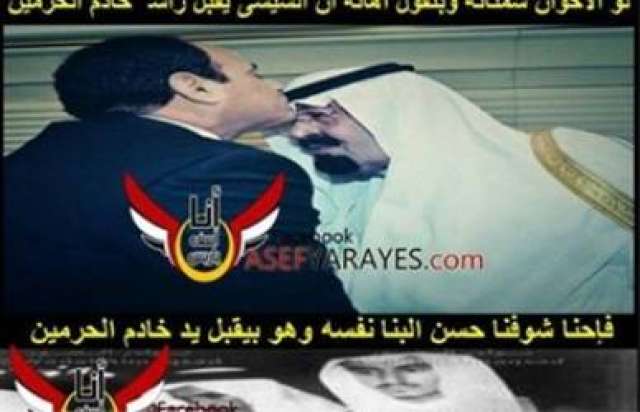وقال أدمن الصفحة فى تدوينة له عبر موقع التواصل الاجتماعى "فيس بوك"، "إذا كانت الإخوان شمتانة وبتقول اهانة إن السيسي يقبل رأس خادم الحرمين، فإحنا شوفنا حسن البنا نفسه وهو بيقبل يد خادم الحرمين، وعلى فكرة يا جماعة بالنسبة للناس اللي بتتريق، مش عيب إن المشير السيسي يطلع يقابل خادم الحرمين في الطيارة، أوباما نفسه لما جه مصر طلع السلم جري علشان يسلم على الرئيس مبارك، احترام الكبير دائما واجب".