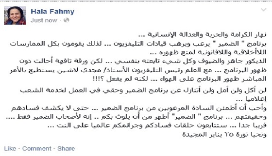 وتابعت بقولها: "لن أكل ولن أمل ولن أتنازل عن برنامج الضمير، وحقي في العمل لخدمة الشعب إعلاميا، وأحب أن أطمئن السادة المرعوبين من برنامج الضمير، حتى لا يكشف فسادهم وحقيقتهم، برنامج الضمير أطهر من أن يلوث بكم، إنه لأصحاب الضمير فقط، قريبًا جدا، ستتابعون حلقات فسادكم وجرائمكم عالميا على النت، وتحيا ثورة ٢٥ يناير المجيدة".
