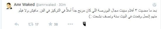 أثار الفنان عمرو واكد، الجدل عبر صفحته بموقع التواصل الاجتماعى "تويتر"، بعد إعلانه عن ترك مجال البورصة من أجل تصوير 3 أفلام والتى لم يتم تصوير أى منها وأنه موجود بمنزله منذ عام ونص، قائلاً:" "قاعد بشحت".