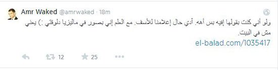 وتابع قائلاً: "أتوقع التويتة اللى فاتت تنزل خبر إنى قاعد فى البيت بشحت دلوقتى. هههه يلا خليهم يخزوا العين".
