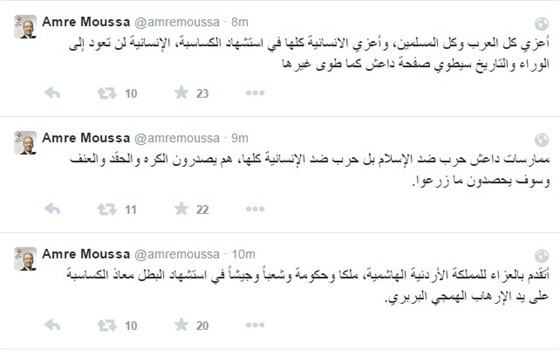 قدم عمرو موسى، أمين عام الجامعة العربية الأسبق، عزاءه للمملكة الأردنية ملكًا وحكومة وشعبًا وجيشًا في استشهاد الطيار الأردني معاذ الكساسبة، مؤكدًا أن ممارسات "داعش" تعد حربا ضد الإسلام والإنسانية كلها، مشيرًا إلى أنهم يصدرون الكرة والعنف ويحصدون ما زرعوا.
