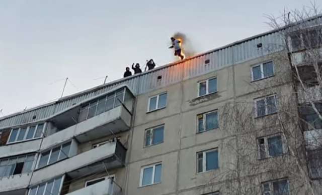 أشعل مغامر روسي شاب النار في نفسه ثم قفز من سطح مبنى سكني مكون من 9 طوابق، وذلك أمام الكاميرات، ليحقق هذا التسجيل أكثر من مليون مشاهدة في 3 أيام على الـ«يوتيوب».