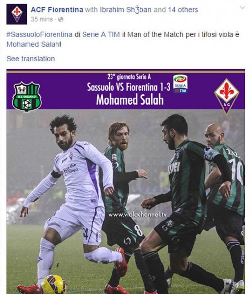 أعلنت الصفحة الرسمية لنادى فيورنتينا الإيطالى، على موقع التواصل الاجتماعى "فيس بوك"، اختيار النجم المصرى محمد صلاح، أفضل لاعب فى مباراة "الفيولا"، مع ساسولو، والتى أقيمت السبت الماضى، ضمن منافسات الجولة الـ23 للدورى الإيطالى "الكالتشيو".