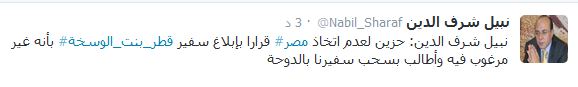 وكتب شرف الدين، عبر تغريدة له على "تويتر": "حزين لعدم اتخاذ مصر قرارا بإبلاغ سفير (قطر بنت الـ .....) بأنه غير مرغوب فيه وأطالب بسحب سفيرنا بالدوحة".