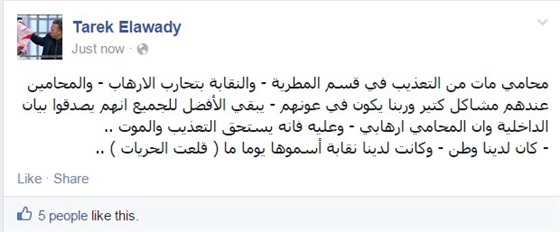 وكتب العوضي تدوينة على "فيس بوك" قال فيها: "محام مات من التعذيب في قسم المطرية - والنقابة بتحارب الإرهاب - والمحامون عندهم مشاكل كتير وربنا يكون في عونهم - يبقى الأفضل للجميع أنهم يصدقوا بيان الداخلية وأن المحامي إرهابي - وعليه فإنه يستحق التعذيب والموت.. كانت لدينا نقابة أسموها يوما ما قلعة الحريات".