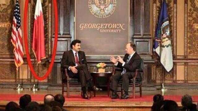 نشرت فجر السعيد، الكاتبة الكويتية، وصاحبة أول حوار مع الرئيس الأسبق حسني مبارك، صورًا قالت إنها من مناقشة طلاب جامعة جورج تاون، لأمير قطر تميم بن حمد، خلال زيارته للولايات المتحدة الأمريكية، مشيرة إلي أن العلم الموجود خلف حاكم قطر يخص دولة البحرين.