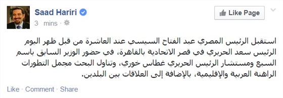 وكتب الحريري تدوينة على "فيس بوك" قال فيها: "استقبل الرئيس المصري عبد الفتاح السيسي عند العاشرة من قبل ظهر اليوم الرئيس سعد الحريري في قصر الاتحادية بالقاهرة، في حضور الوزير السابق باسم السبع ومستشار الرئيس الحريري غطاس خوري، وتناول البحث مجمل التطورات الراهنة العربية والإقليمية، بالإضافة إلى العلاقات بين البلدين".