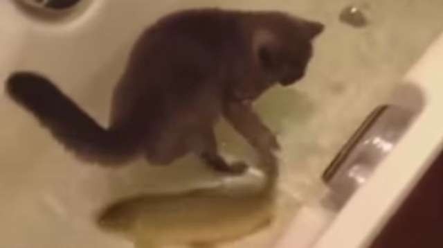 بالفيديو.. قط يخرج على المألوف ويستمتع باللعب مع السمك