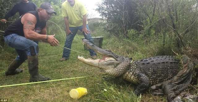 استطاع "جار سوريدج" 45 عاما صائد الحيوانات البرية الإمساك بتمساح عملاق بيديه العاريتين، والذي عثر عليه بالفناء الخلفى لأحد المنازل بولاية تكساس الأمريكية.