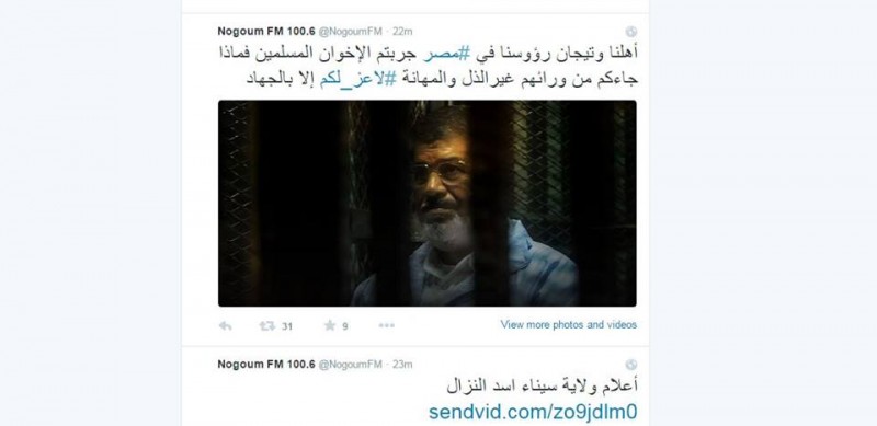 وخاطب «داعش» أهل مصر عبر حساب إذاعة الأغاني، ناشرًا السيرة الذاتية لزعيمهم أبوبكر البغدادي، كما حرضوا المصريون على «الجهاد» قائلين تعليقًا على صورة للرئيس الأسبق محمد مرسي محبوسًا «أهلنا وتيجان رؤوسنا في مصر