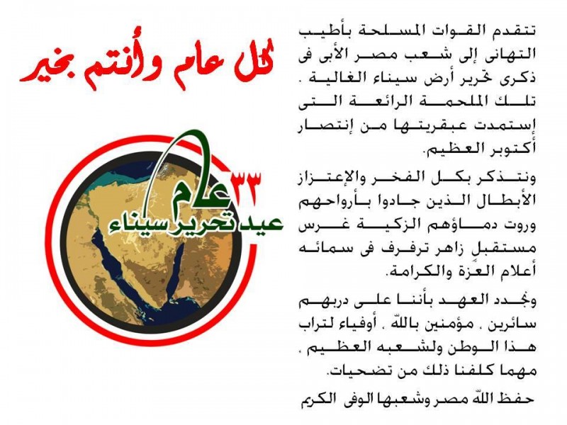 قدم المتحدث العسكري، العميد محمد سمير، التهنئة للشعب المصري العظيم في ذكرى تحرير أرض سيناء الغالية.