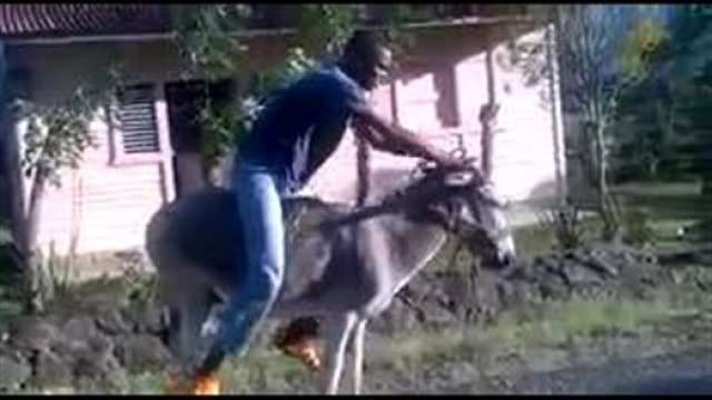 أظهر الشاب قدرته في التمثيل وهو يحاول تشغيل الحمار مستعينًا بمؤثرات صوتية، حيث استغرق الأمر عدة محاولات، واضطر إلى النزول من على ظهره ليتحقق أن كل شئ يعمل، وصعد مرة أخرى لينطلق مسرعًا على الطريق.