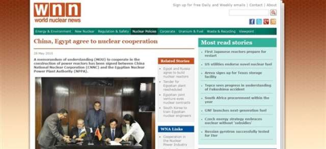 ذكرت مؤسسة وورلد نيوكلير نيوز البريطانية، أن مصر وقعت مذكرة تفاهم مع الصين تتعلق بالتعاون في المجال النووي.