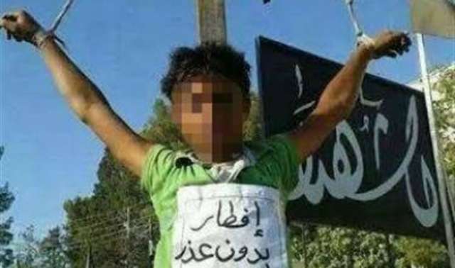 فى واقعة لا تقل بشاعة عن الممارسات اللا انسانية التى التصقت بـ "داعش"، قام التنظيم بتعليق طفلين على أحد الأعمدة لاتهامهما بالافطار فى نهار رمضان.