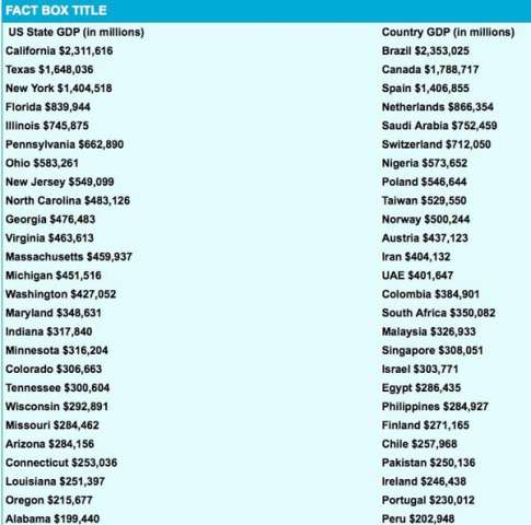 وكشف التقرير الذى نشره موقع منظمة الصحافة العالمية أن الناتج المحلي الإجمالي لولاية تكساس يصل لنحو 1.6 مليار دولار والذي يتطابق مع كندا والتى يصل ناتجها المحلى الإجمالى نحو 1.7 تريليون دولار.