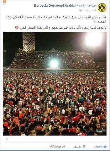 ونشرت صفحة الفريق الألماني صورة لجماهير الأهلي محتشدة بملعب مختار التتش، وعلقت عليها: "جمهور لم يحتفل بدرع الدوري، وإنما هو خلف فريقه مساندًا له وقت المحنة.. لا يوجد لدينا انتماء لأي نادٍ غير دورتموند، ولكن هذا المنظر أبهرنا".