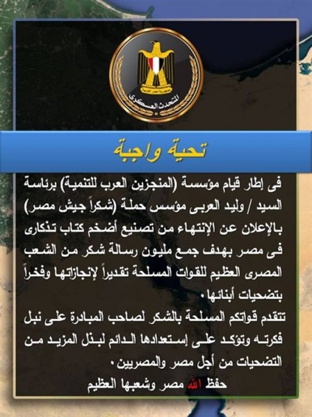 ثمن المتحدث العسكري للقوات المسلحة، العميد محمد سمير، عبر صفحته الرسمية على "فيس بوك"، ما قامت به مؤسسة "المنجزين العرب للتنمية" برئاسة وليد العربي، مؤسس حملة «شكرًا جيش مصر»، وذلك بعد إعلانها عن الانتهاء من تصنيع أضخم كتاب تذكاري في مصر، بهدف جمع مليون رسالة شكر من الشعب المصري للقوات المسلحة تقديرًا لإنجازاتها.