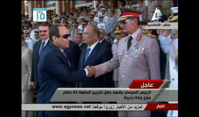 صافح الرئيس عبدالفتاح السيسي فور وصوله إلى مقر كلية الدفاع الجوي لحضور مراسم احتفال بتخريج الدفعة 66 للكلية البحرية والدفعة 43 لكلية الدفاع الجوي الفريق صدقي صبحي وزير الدفاع وكبار القادة بالجيش.