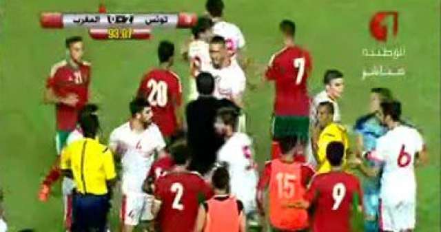 بالفيديو.. اشتباكات عنيفة بين لاعبى تونس والمغرب فى ملعب ”رادس”