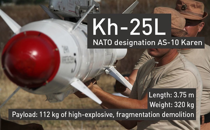 ويبلغ وزن صورايخ KH-29L، 660 كيلو جرام وطولها 3.9 أمتار وحمولتها 317 كيلوجراما.